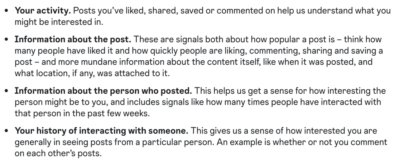 Takeaway: The emphasis on personalization is a reminder that brands should focus on creating high-quality content that encourages engagement (likes, shares, comments). And when they talk about the signals such as how quickly people are liking, commenting, sharing and saving a post – velocity matters.