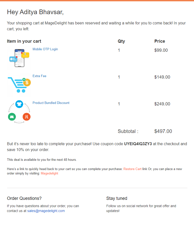 For successfully recovering lost sales, your email must be well-designed and visually appealing. You can also consider incentivizing customers by offering a discount coupon or a complimentary gift. Doing so will increase the conversion ratio a great extent.