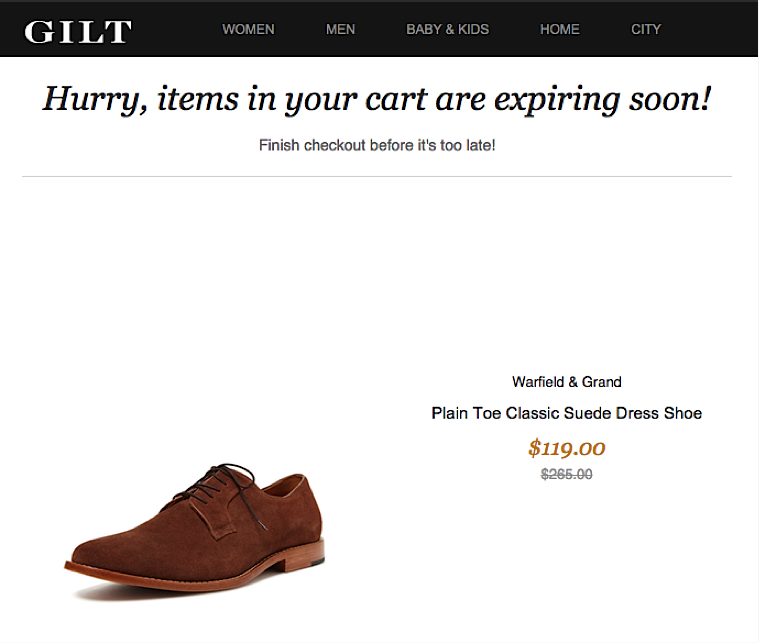- Add urgency. 72% of people who buy a product after abandoning their carts do so within 24 hours. This is why it’s important to get shoppers to take action as quickly as possible. Gilt does this by saying that the cart items are expiring soon.