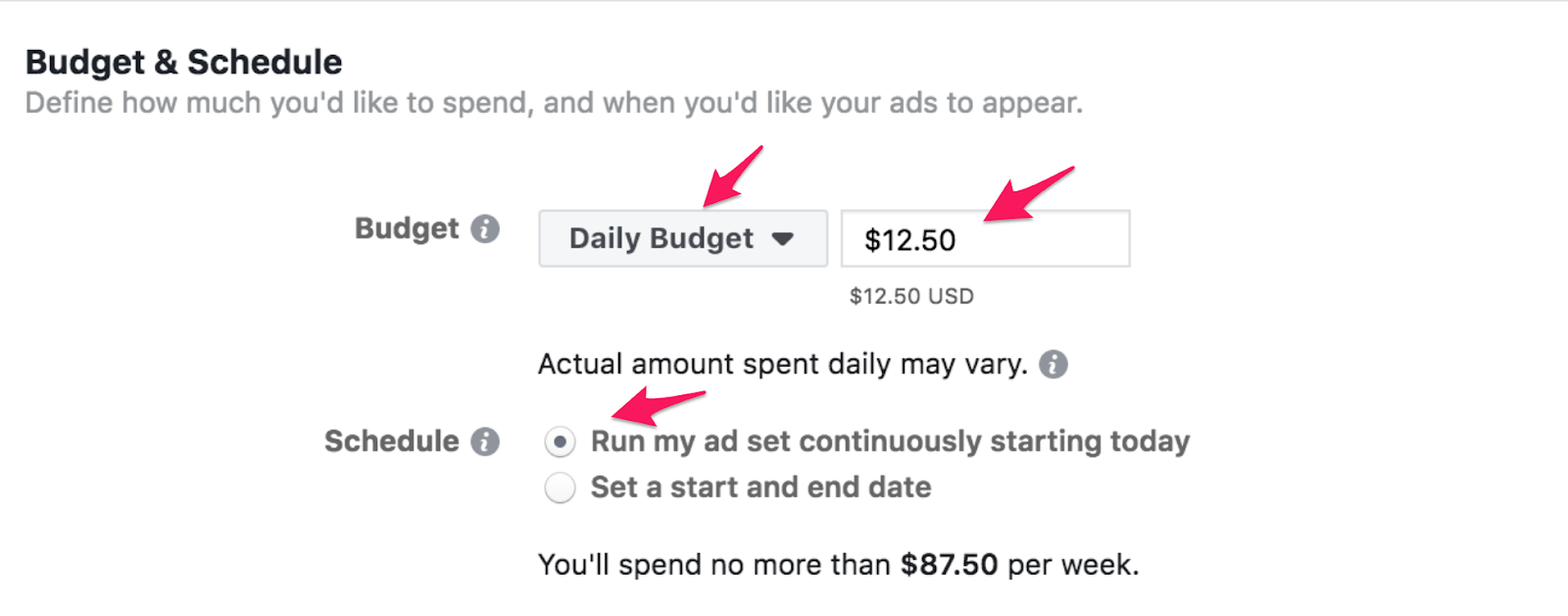 Scroll down to “Budget & Schedule” and determine the budget. In this case, there’s no right or wrong answer on how much you should spend, as this depends on your budget and desired goals. Generally speaking, the more you invest, the more traffic you will drive. If you want fast results, allocate more cash to your daily budget.