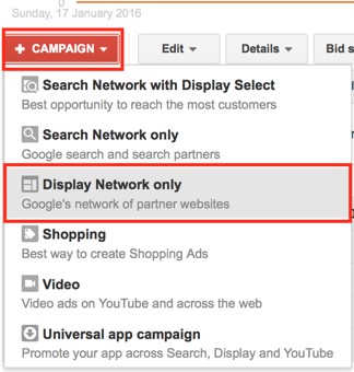 - In AdWords, go to Campaigns, then head over to +Campaigns > Display Network Only.