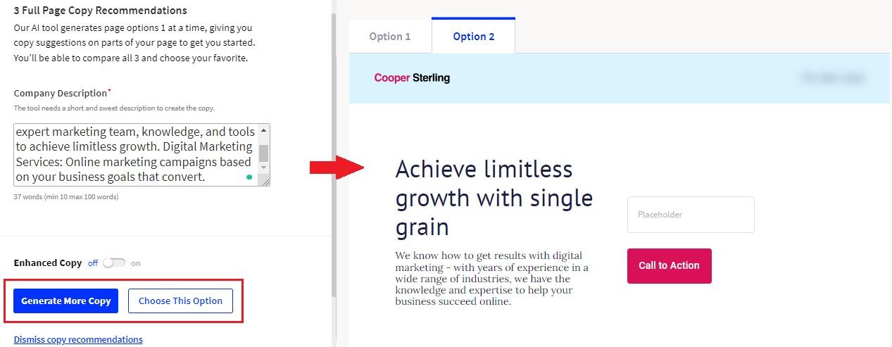 The AI generator then works on filling your page with optimized content. If you don’t like the suggested copy, you can always click Generate More Copy to try something different or select Choose This Option to go with Unbounce’s suggestion: